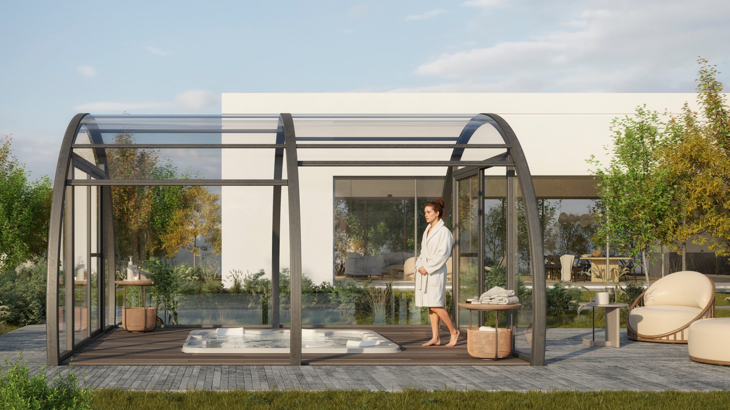 La cubierta Vision es la última incorporación a nuestro catálogo: un modelo fijo para spa con silueta semicircular que, gracias a su diseño en forma de arco y su cierre 100% en policarbonato compacto transparente le proporciona una vista panorámica exterior mientras disfruta de su spa. Además del acceso principal en la fachada, este modelo ofrece la posibilidad de integrar una trampilla lateral en uno o todos sus módulos, lo que añade una sensación de amplitud e integración con el entorno.