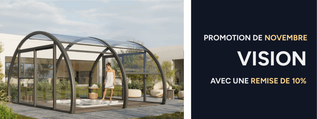 Et parce que nous savons que l’installation d’un abri représente un véritable investissement, nous vous proposons une offre exceptionnelle tout au long du mois de novembre pour profiter pleinement de votre spa. Du 1er au 30 novembre, vous pouvez acquérir notre modèle exclusif Vision avec 10 % de remise.
